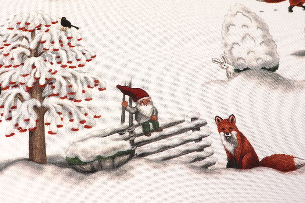 Dieser hochwertige Baumwollstoff bringt skandinavischen Zauber direkt in Ihr Zuhause. Das detailverliebte Digitaldruck-Design aus Schweden zeigt verspielte Wichtel und Tiere, die eine gemütliche Winterstimmung verbreiten. Dank seiner feinen Baumwollqualität liegt der Stoff angenehm in der Hand, ist atmungsaktiv und leicht zu verarbeiten.