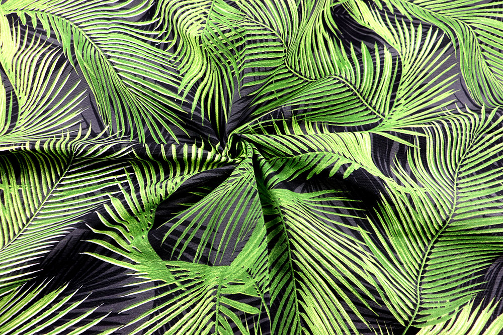 Dieser Dekostoff mit seinem lebendigen Palmblatt-Motiv bringt ein frisches, natürliches Flair in jeden Raum. Die realistische Darstellung der Blätter in Kombination mit der matten, fein strukturierten Oberfläche sorgt für eine dekorative Optik, die sowohl modern als auch harmonisch wirkt.