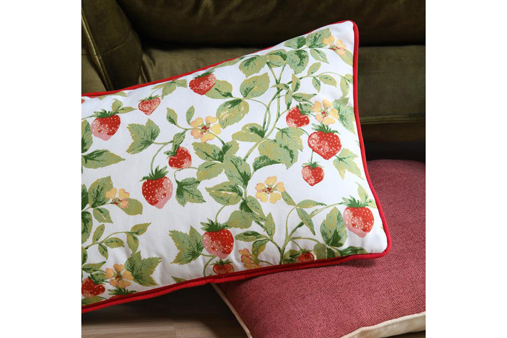 Erdbeeren sind immer und überall beliebt: auch als Stoff-Design! Hier zieren die leckeren Früchte eine