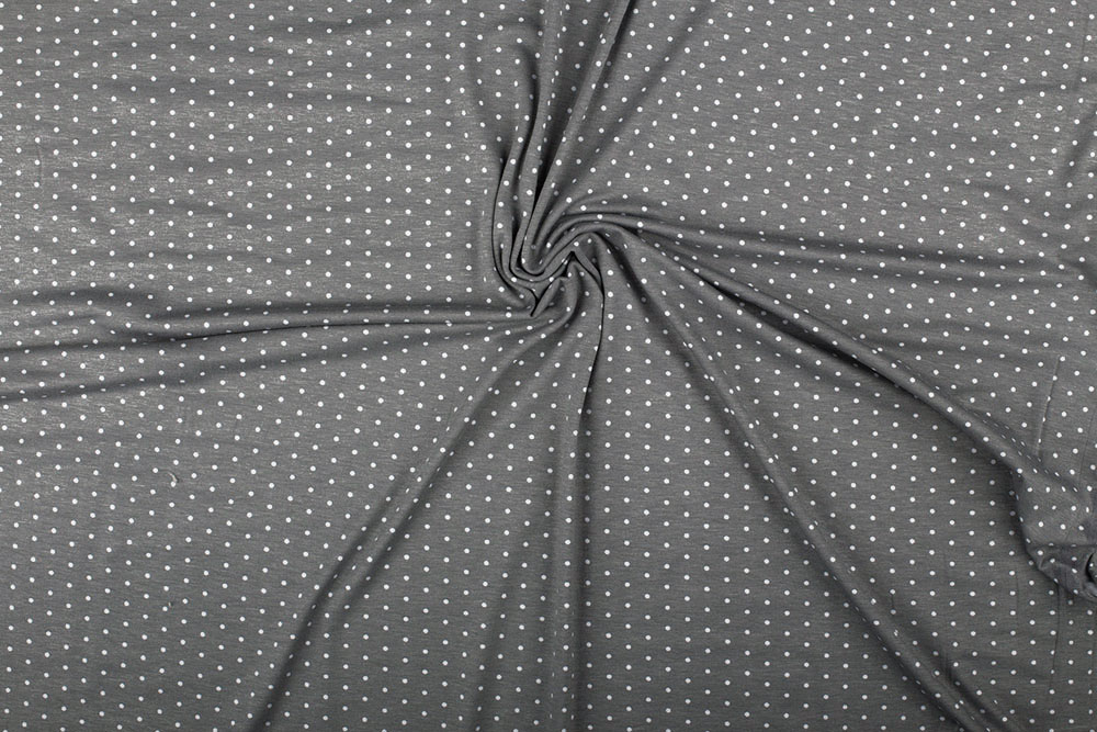 Hübsches Pünktchen-Motiv auf hochwertiger Baumwoll-Jerseyware in hübschem Grau. Die Ware ist sehr hautsympathisch. Der Elasthan-Anteil sorgt dafür, dass der Stoff sehr dehnbar ist, der Baumwoll-Anteil sorgt für einen schönen, natürlichen Warengriff. Ideal geeignet für Oberbekleidung jeglicher Art, Heimtextilien, Accessoires und vieles weitere mehr.