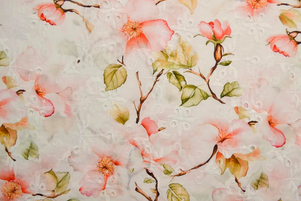 Dieser wunderschöne Baumwollstoff begeistert mit einem romantischen Blütendesign auf zartem, hellem Untergrund. Die filigranen Blütenzweige verleihen dem Stoff eine elegante, frühlingshafte Ausstrahlung, während die dezente Lochstickerei für eine besondere Struktur und hochwertige Optik sorgt. Dadurch wirkt der Stoff leicht, feminin und gleichzeitig modern.