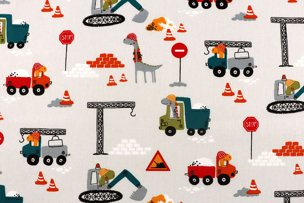 Wenn Sie einen kindgerechten, widerstandsfähigen Stoff mit hohem Spaßfaktor suchen, ist dieser Baumwoll-Polyester-Stoff mit Dinos auf der Baustelle die ideale Wahl für fantasievolle Nähideen.