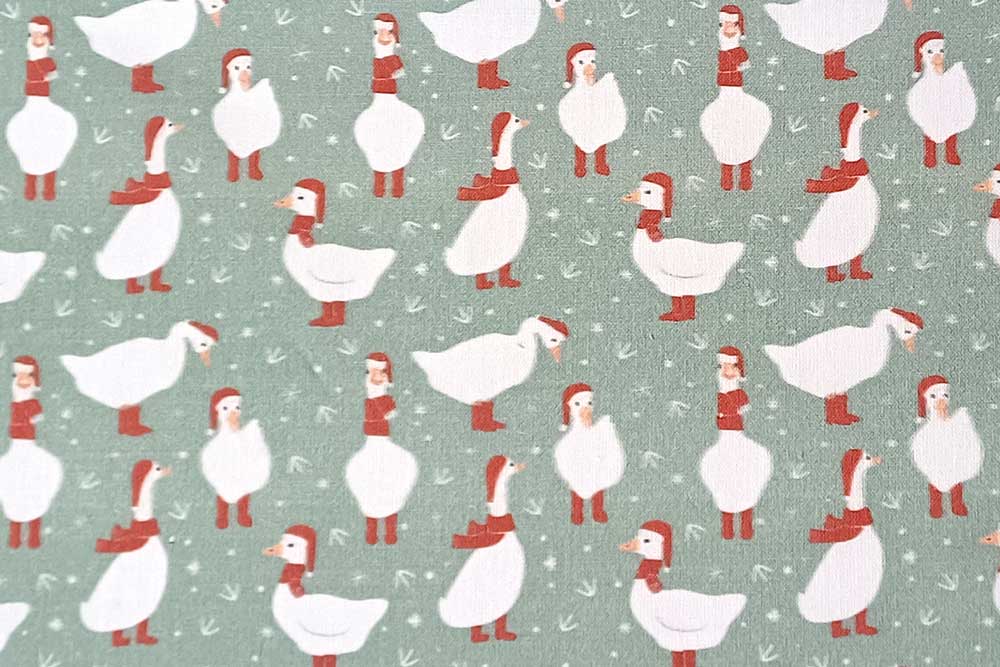 Ein Baumwollstoff mit Humor und Herz: Das fröhliche Weihnachtsmotiv mit gut gelaunten Gänsen sorgt für festliche Stimmung und ein Lächeln zugleich.