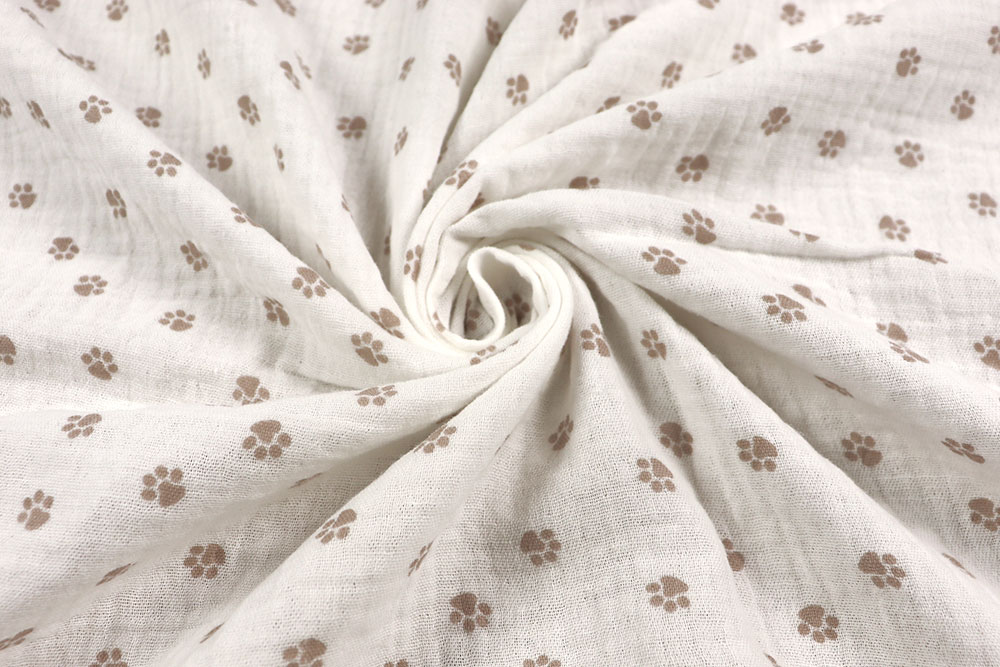 Das Design zeigt ein zartes Allover-Muster aus kleinen, gleichmäßig verteilten Pfotenabdrücken. Die Pfötchen sind in einem warmen Beige-Ton gehalten und heben sich sanft vom weißen Hintergrund ab.