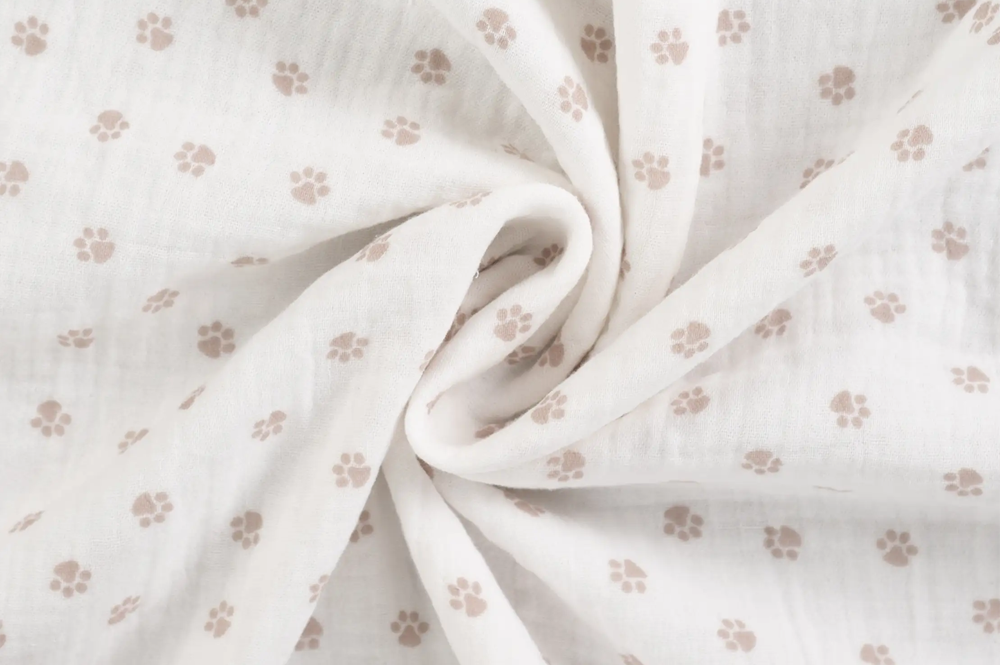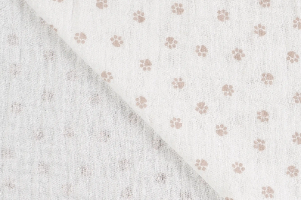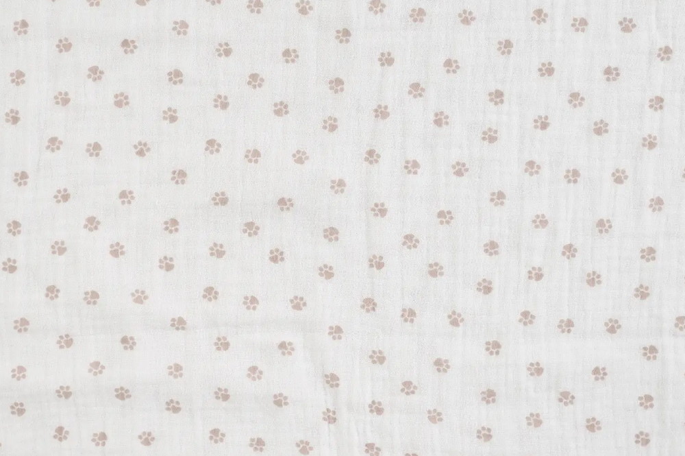 Das Design zeigt ein zartes Allover-Muster aus kleinen, gleichmäßig verteilten Pfotenabdrücken. Die Pfötchen sind in einem warmen Beige-Ton gehalten und heben sich sanft vom weißen Hintergrund ab.