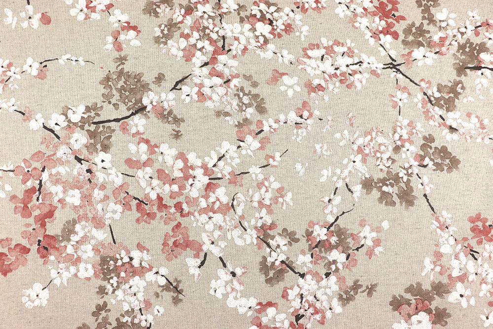 Dieser Dekostoff versprüht die stille Eleganz japanischer Kirschgärten: Auf einem Hintergrund in natürlichem Beigeton entfalten sich stilisierte Kirschblüten in sanften Rosa- und Weißnuancen. Das filigrane Design wirkt beruhigend und stilvoll – ideal für ein harmonisches Raumgefühl mit fernöstlicher Note.