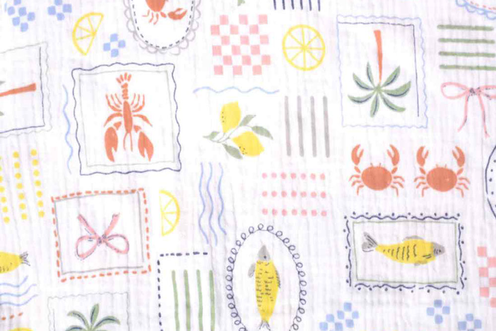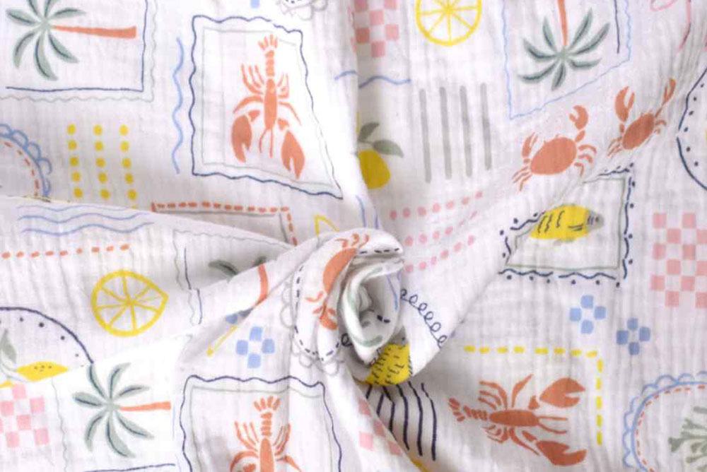 Bunte Urlaubsmotive zieren diesen schönen Musselinstoff. Bei Double Gauze werden zwei Lagen Musselin