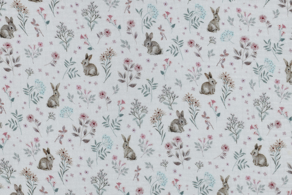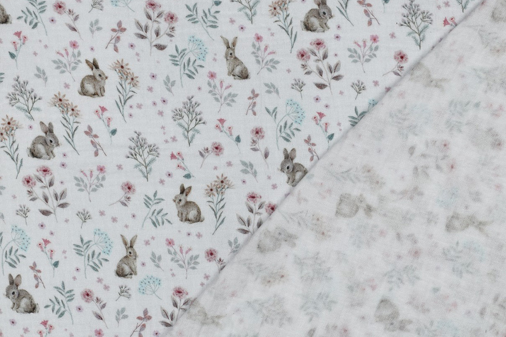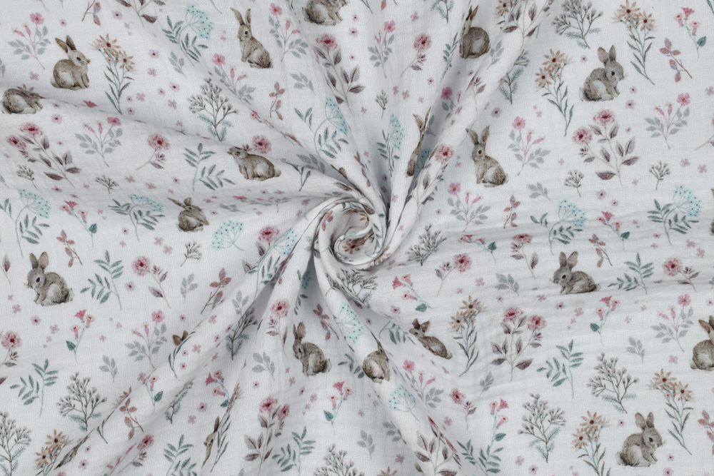 Süße Hasen und zarte Blumen machen diesen Musselin zu einem perfekten Stoff für frühlingshafte Nähideen.