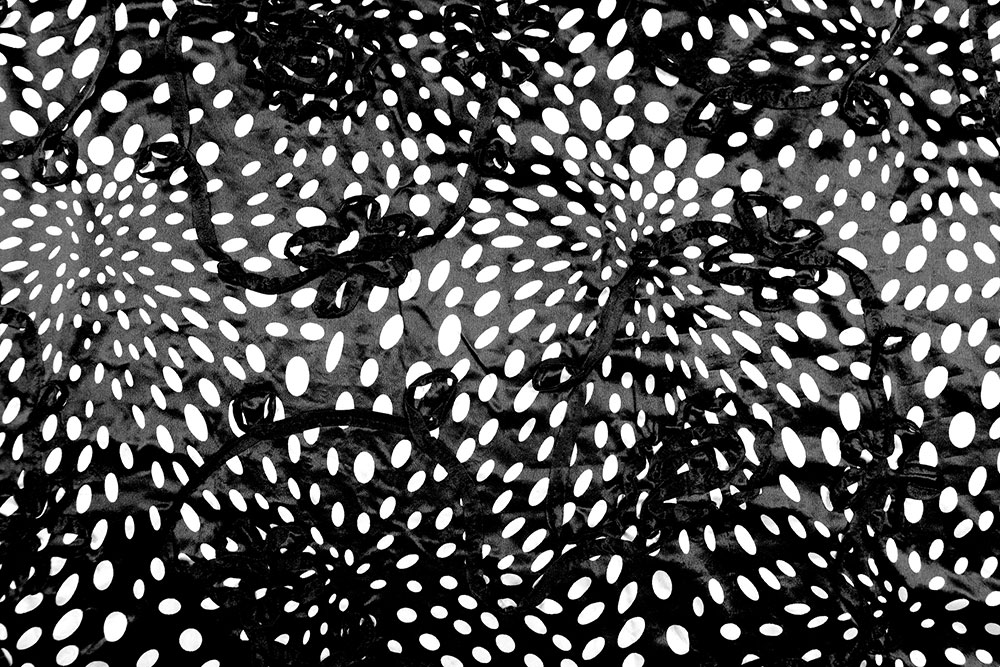 Dieser auffällige Satin kombiniert ein klassisches schwarzes Grundgewebe mit großen, weißen Tupfen und einer dekorativen, floral anmutenden Stickerei. Das Zusammenspiel aus glänzender Oberfläche und texturierten Applikationen verleiht dem Stoff eine elegante, fast theatrale Wirkung.