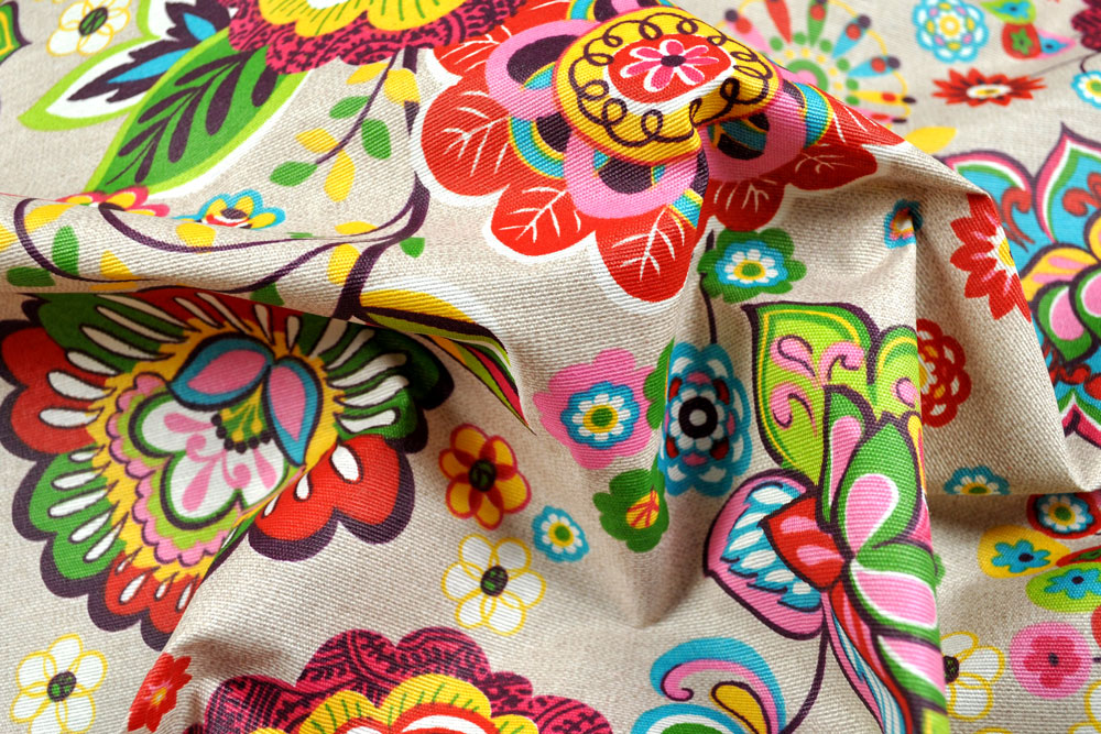Dieser beschichtete Stoff bringt sofort sommerliches Flair in jeden Raum. Man findet auf ihm Blumen im Mandala-Stil in prächtiger Farbzusammenstellung. Das feucht abwischbare Material ist fleckabweisend und perfekt für den Einsatz im Indoor- und Outdoor-Bereich geeignet. Fertigen Sie daraus nicht nur trendige Tischwäsche, auch Bezüge für Gartenmöbel und Accessoires, wie. z.B. Taschen, kommen damit toll zur Geltung. Der Polyesteranteil macht den Stoff knitterarm und pflegeleicht, während der Baumwollanteil für die natürliche Optik sorgt.