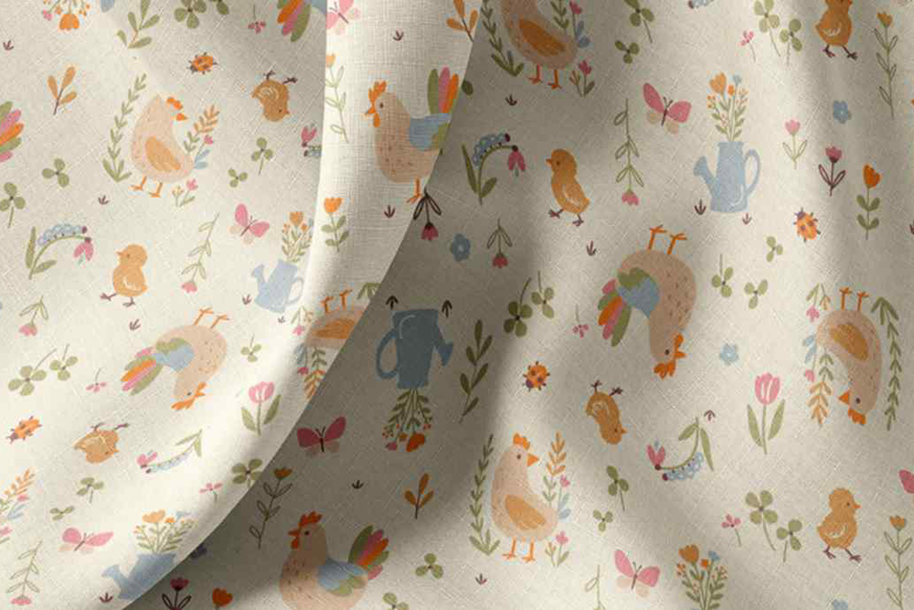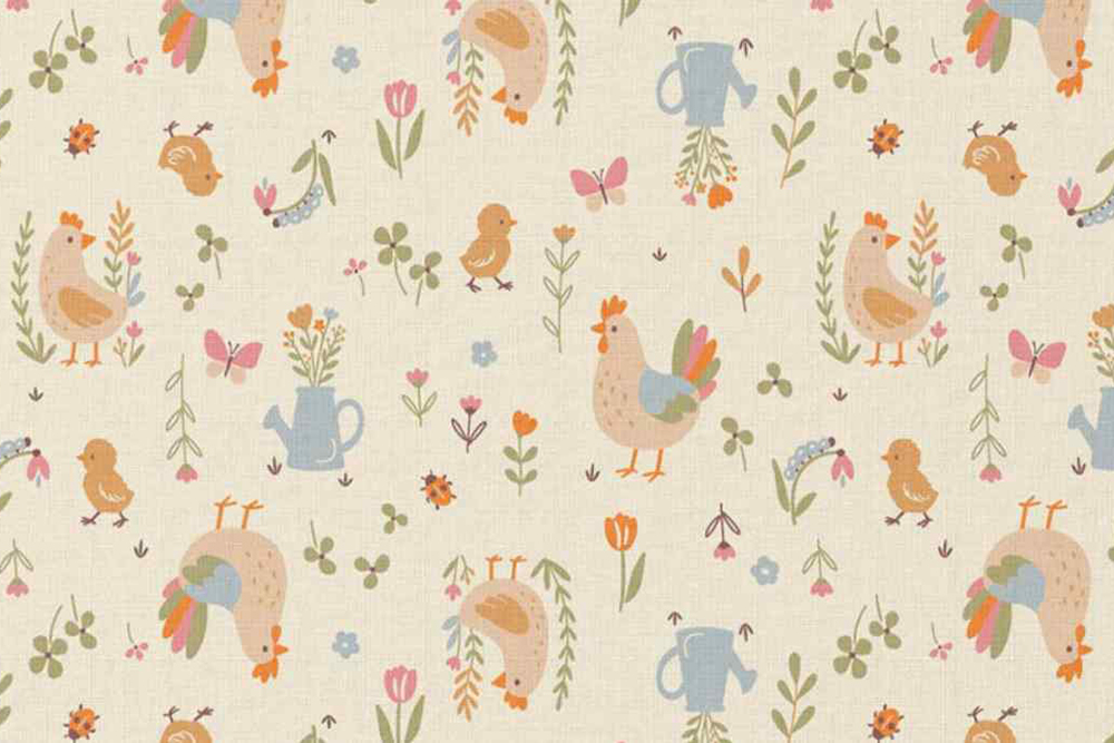 Dieser Baumwollstoff mit liebevollem Huhn-und-Küken-Print bringt ländlichen Charme und eine Portion Niedlichkeit in jedes Nähprojekt. Die harmonisch gestalteten Motive wirken freundlich und kindgerecht und machen den Stoff zu einem echten Lieblingsmaterial für kleine und große Kreativideen.